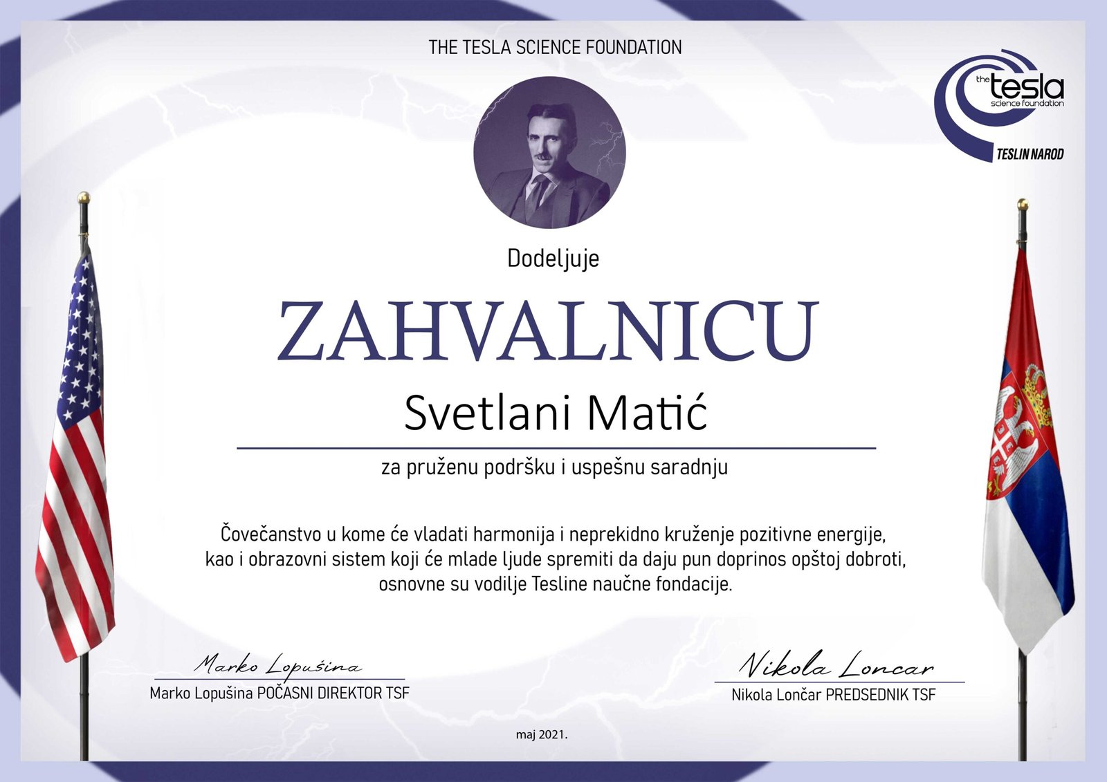 „Veoma sam srećna i ponosna što sam dobitnica Srebrne Tesline medalje i Zahvalnice zbog zasluga na polju obrazovanja i kulture, učinjenih za srpski narod, a zahvaljujući odluci Tesline naučne fondacije iz Filadelfije i predsednika Nikole Lončara. U nadi da ću u daljem radu opravdati poverenje i ovako visoko odlikovanje, zahvaljujem se članovima, predsedniku i počasnom direktoru, ove ugledne institucije, koji su odlučivali o nagradama.“ Najveći srpski i svetski genije Nikola Tesla, govorio je:“Kada sam bio suočen sa nekim iscrpljujućim zadatkom, radio bih na njemu i vraćao se ponovo i ponovo dok ga ne bih završio. Tako sam praktikovao dan za danom, od jutra do noći. Isprva je to zahtevalo snažan mentalni napor usmeren protiv sklonosti i želja, ali kako su godine prolazile, ovo suprostavljanje je slabilo, i na kraju moja volja i želja postale su jedno i isto. Takve su one i danas, i to je tajna svih mojih uspeha.“